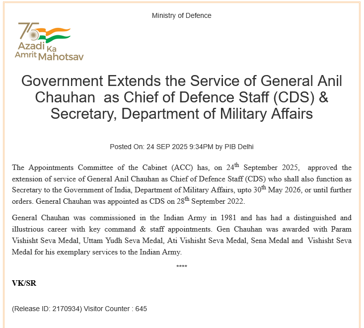 In a statement issued on Tuesday, the Ministry of Defence said: “The Appointments Committee of the Cabinet (ACC) has, on 24th September 2025, approved the extension of service of General Anil Chauhan as Chief of Defence Staff (CDS) who shall also function as Secretary to the