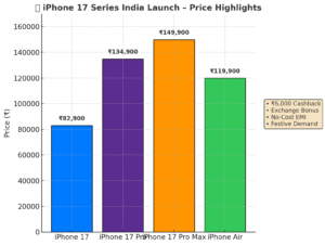 The pricing strategy for the iPhone 17 series places the standard model at around ₹82,900, while the iPhone 17 Pro starts at approximately ₹1,34,900. The iPhone 17 Pro Max, aimed at premium buyers, carries a price tag of nearly ₹1,49,900. Meanwhile, Apple has introduced a new variant, the iPhone Air, which begins at about ₹1,19,900 and is designed for those who prefer a lighter, sleeker device. All models now come with 256 GB of base storage, reflecting Apple’s shift toward higher-capacity devices.